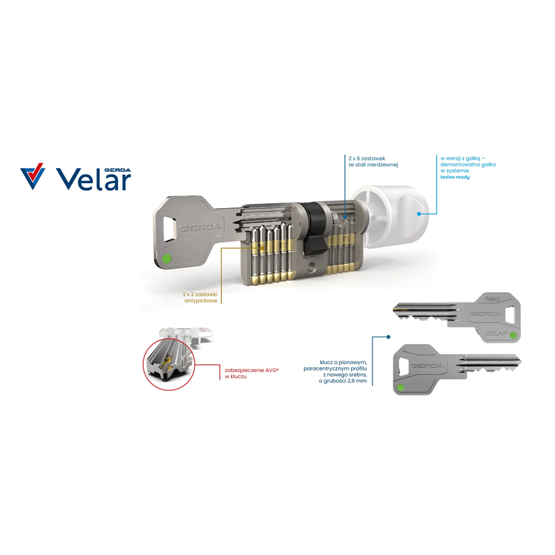 Te zaawansowane cechy sprawiają, że wkładka bębenkowa Gerda Velar jest nie tylko niezawodnym elementem systemu Master Key, ale także reprezentuje najnowocześniejsze podejście do zabezpieczeń, łącząc innowacyjność z funkcjonalnością. Idealnie nadaje się do zastosowań w różnych typach nieruchomości, od prywatnych domów po duże obiekty komercyjne.