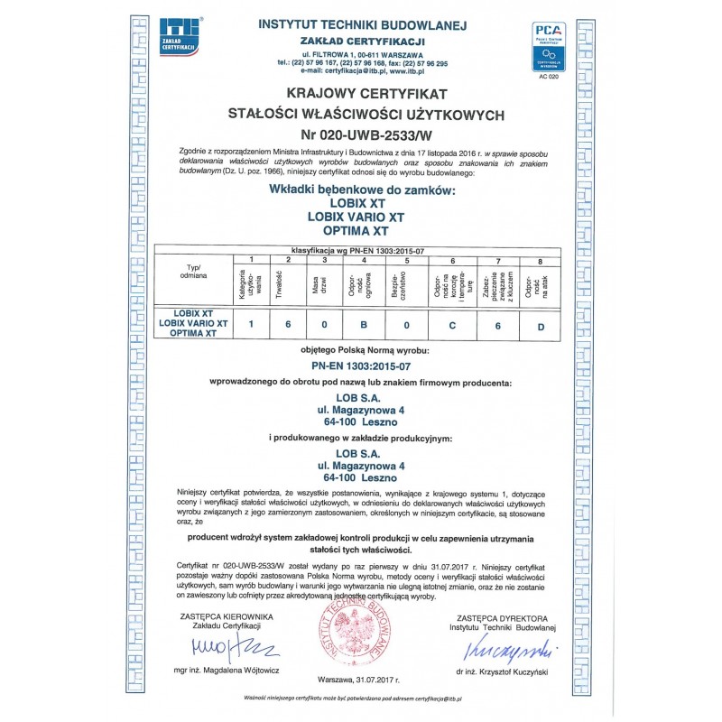 Wkładka bębenkowa dwustronna LOB Optima, działająca w systemie Lob Master Key, o wymiarach A: 45 mm, B: 75 mm (patrz schemat). Obudowa wkładki wykończona w kolorze satynowy nikiel. Wkładka posiada 6 klasę zabezpieczenia klucza, zgodnie z normą EN 1303:2015-1 oraz klasę C odporności na włamanie, zgodnie z kryterium ITB KW/WQ-02 2014.