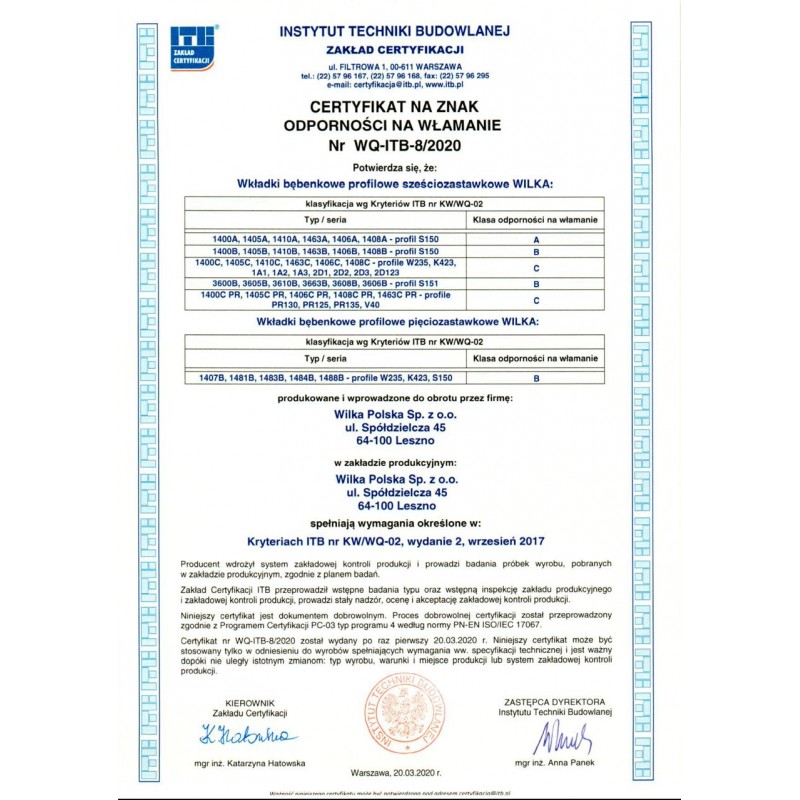 Wkładka bębenkowa dwustronna WILKA 1400, działająca w systemie jednego klucza Wilka System C, o wymiarach A: 40 mm, B: 60 mm (patrz schemat). Obudowa wkładki wykończona w kolorze satynowy nikiel. Wkładka posiada 6 klasę zabezpieczenia klucza oraz klasę C odporności na włamanie, zgodnie z normami PN-EN 1303:2007 oraz PN-91/B-94461/02. Wkładka otrzymała certyfikat Instytutu Mechaniki Precyzyjnej, potwierdzający wysoką jakość wykonania oraz właściwości antywłamaniowe. Numer katalogowy wkładki: WIL-C-1400-40-60-N