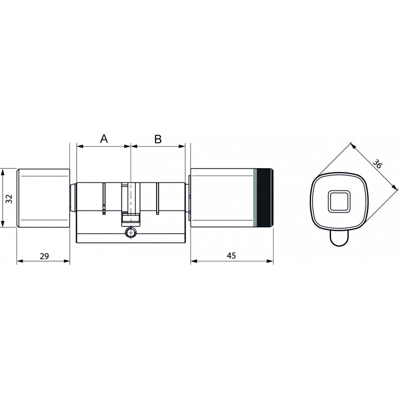 Rozmiar wkładki elektronicznej dobieramy tak jak rozmiar standardowej wkładki bębenkowej. Wymiar A to odległość od śruby montażowej do krawędzi drzwi po stronie wewnętrznej pomieszczenia plus grubość szyldu. Wymiar B to odległość od śruby montażowej do krawędzi drzwi na zewnątrz pomieszczenia plus grubość szyldu.